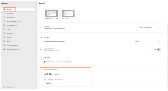 Bước 3: Tại mục General, kiểm tra thông tin Microsoft cloud storage. Đây là tổng dung lượng tệp đính kèm bạn đã gửi lên teams